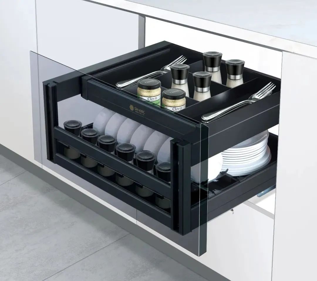 在廚房功能五金區(qū)域,星徽精密展出了全鋁星耀系列產(chǎn)品,簡約的設計加上采用全鋁與鋼化玻璃的組合,精細的做工,盡顯全鋁拉籃的輕奢高級。